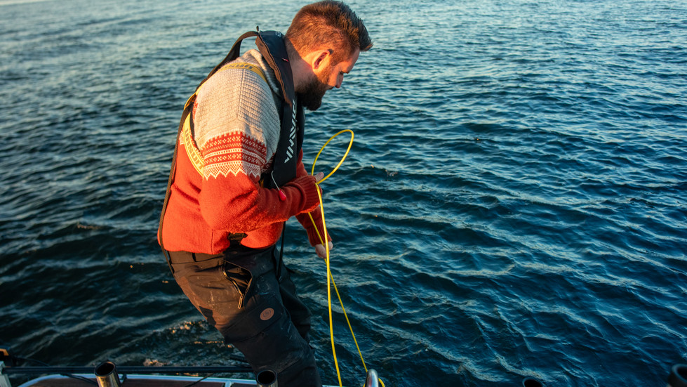 Jørgen haler opp ei teine ved hjelp av ledningen til DTG3. Fornøyd kar når den er sikret i båten!